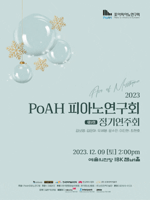 제9회 PoAH 피아노연구회 정기연주회 기간 : 2023-12-09 ~ 2023-12-09 장소 : 예술의전당 [서울] IBK챔버홀 문의처 : 지클레프 02-515-5123 요금 : 전석 30,000원 음악/콘서트 서울 예매하기