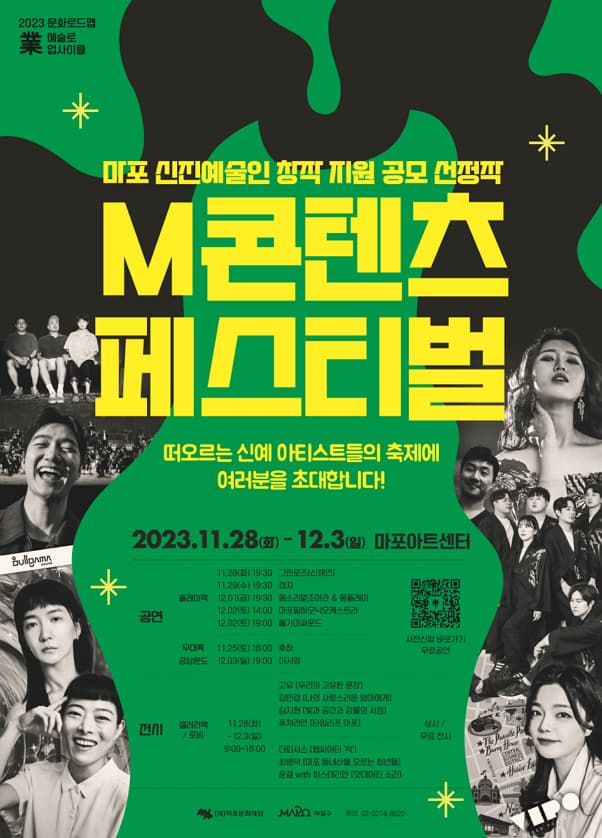 예술로업싸이클 [M-콘텐츠 페스티벌] 기간 : 2023-11-28 ~ 2023-12-03 장소 : 마포아트센터 문의처 : 마포문화재단 02-3274-8622 요금 : 행사/축제 서울 예매하기