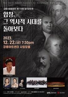 [강릉] 제114회 강릉시립합창단 정기연주회: 합창, 그 역사적 시대를 돌아보다 기간 : 2023-12-22 ~ 2023-12-22 장소 : 강릉아트센터(구. 강릉문화예술관) 사임당홀(대공연장) 문의처 : 강릉시립합창단 033-660-6857 요금 : 전석 10,000원 음악/콘서트 강원 예매하기
