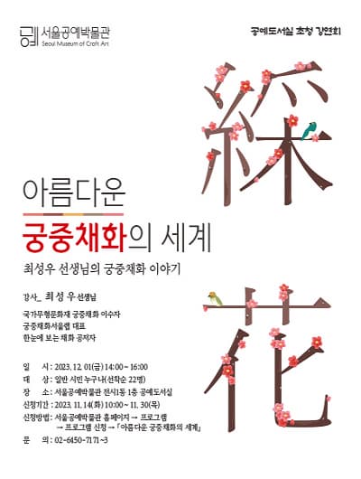 공예도서실 초청 강연회『아름다운 궁중채화의 세계』 기간 : 2023-12-01 ~ 2023-12-01 장소 : 문의처 : 02-6450-7171~3 요금 : 교육/체험 서울 예매하기