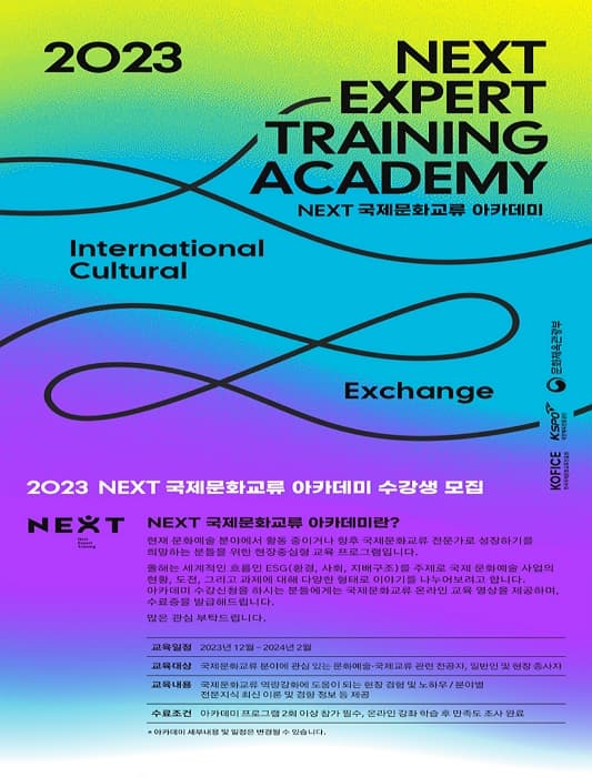 2023 NEXT 국제문화교류 아카데미 기간 : 2023-12-22 ~ 2024-02-02 장소 : 문의처 : next@kofice.or.kr 요금 : 교육/체험 예매하기