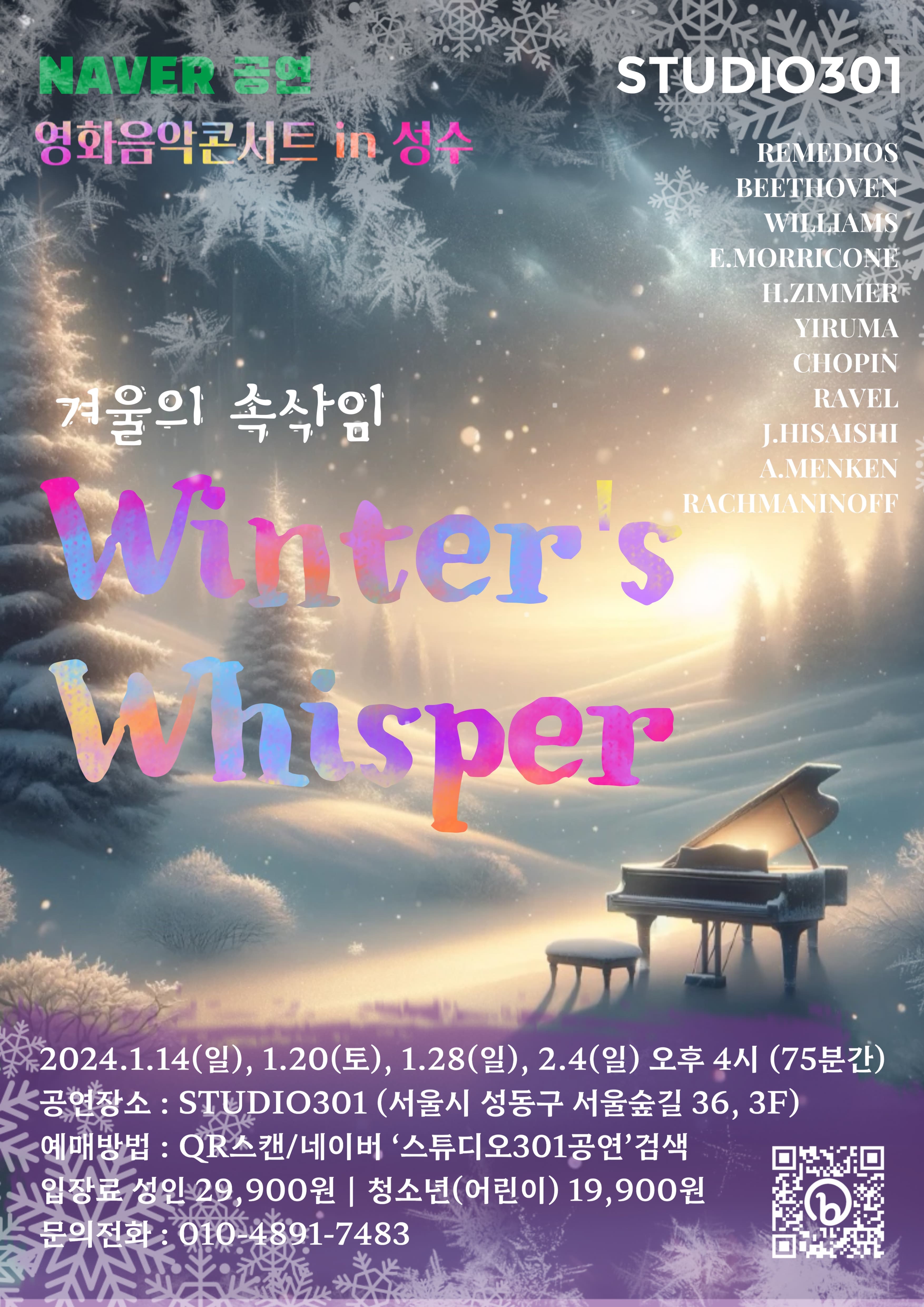 영화음악콘서트 in 성수 Winter’s Whisper: 겨울의 속삭임 기간 : 2024-02-04 ~ 2024-02-04 장소 : 서울숲 스튜디오301 문의처 : 010-4891-7483 (Studio301 대표전화) 요금 : 성인 29,900 원 / 청소년(어린이) 19,900 원 음악/콘서트 서울 예매하기