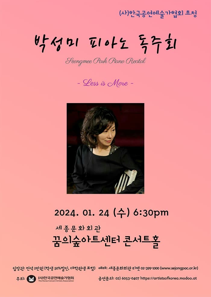 박성미 피아노 독주회 기간 : 2024-01-24 ~ 2024-01-24 장소 : 꿈의숲아트센터 콘서트홀 문의처 : 02-6053-0407 요금 : 전석 30,000원 음악/콘서트 서울 예매하기