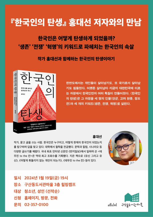 한국인의 탄생 - 홍대선 저자와의 만남 기간 : 2024-01-19 ~ 2024-01-19 장소 : 문의처 : 02-357-0100 (내선 3) 요금 : 교육/체험 서울 예매하기