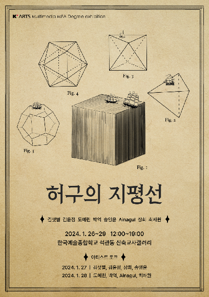 멀티미디어영상과 전문사 졸업전시 <허구의 지평선> 기간 : 2024-01-26 ~ 2024-01-29 장소 : 한국예술종합학교 문의처 : 02-746-9553 요금 : 무료 전시 서울 예매하기