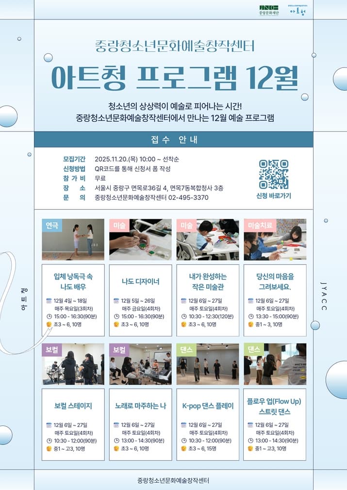 [중랑청소년문화예술창작센터] 12월 아트청 프로그램(선착순/무료)