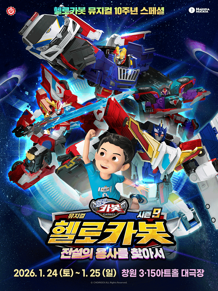 [창원] 헬로카봇 스페셜 시즌 9: 전설의 용사를 찾아서 기간 : 2026-01-24 ~ 2026-01-25 장소 : 3.15아트센터 대극장 문의처 : NOL 티켓 1544-1555 요금 : R석 70,000원, S석 60,000원 뮤지컬/오페라 경남 예매하기